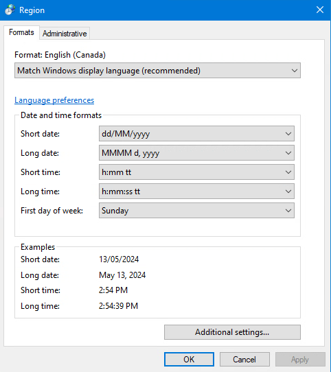 To start, check the system's short date format by going to Control Panel -> Change date, time, or number formats.
