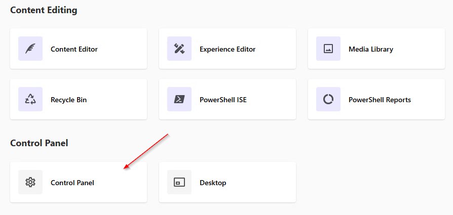 Installing this file will be done from the Control Panel in the Sitecore client. To get there, click the icon in the top left, and then the Control Panel button.