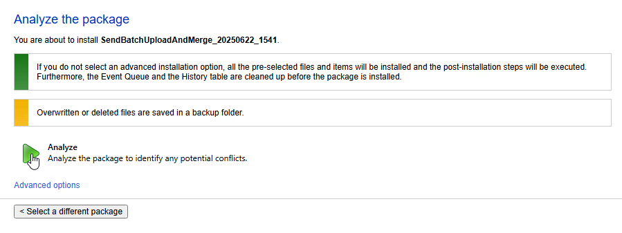When the analysis is complete, click “Analysis result” and then “Install the package”. You may see warnings on this page about items already existing and that's ok. Those are common folders which are parents to the items this module installs.