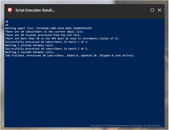 When the module runs it will add any missing records to the email list that it finds in the CSV. If a contact already exists (found by email match), it will update the email list record. If there are existing tags in the destination record, they will be merged with any from the CSV file.