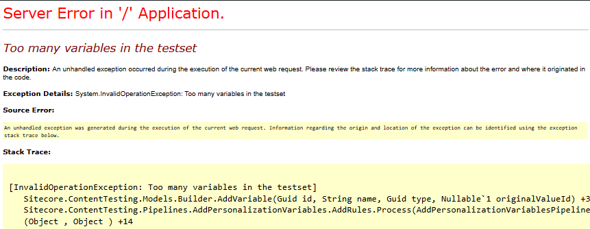 ERROR [Content Testing]: General error when evaluating test exposure. Exception: System.InvalidOperationException Message: Too many variables in the testset Source: Sitecore.ContentTesting at Sitecore.ContentTesting.Models.TestSet.Builder.AddVariable(Guid id, String name, Guid type, Nullable`1 originalValueId) at Sitecore.ContentTesting.Pipelines.AddPersonalizationVariables.AddRules.Process(AddPersonalizationVariablesPipelineArgs args) at (Object , Object ) at Sitecore.Pipelines.CorePipeline.Run(PipelineArgs args) at Sitecore.ContentTesting.Pipelines.AddPersonalizationVariables.AddPersonalizationVariationsPipeline.Run(AddPersonalizationVariablesPipelineArgs args) at Sitecore.ContentTesting.TestManager.GetTestSet(IEnumerable`1 definitions, Item item, ID deviceId) at Sitecore.ContentTesting.Data.SitecoreTestExposureManager.ExposeTest(ITestConfiguration testConfiguration, Item item)